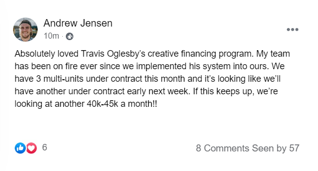17 hour course that’ll take you from the beginning of creative financing to a point where you’ll be able to bring in a significantly higher number of deals via your existing leads.